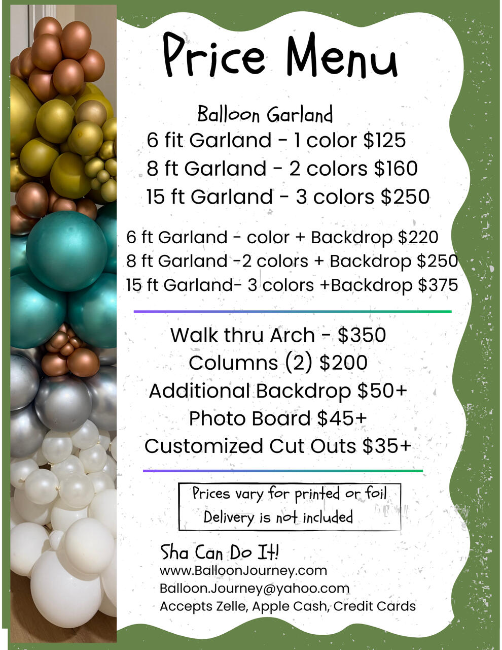 As a balloon artist and crafter, I look forward to working for you. It is my humble pleasure to make your balloon dreams come true. Our practice is to listen to the client and determine your outcome. We will do everything possible to offer you a professional and welcoming experience. We design practical and elegant. We work with your budget to complete YOUR vision. We are ready when you are.